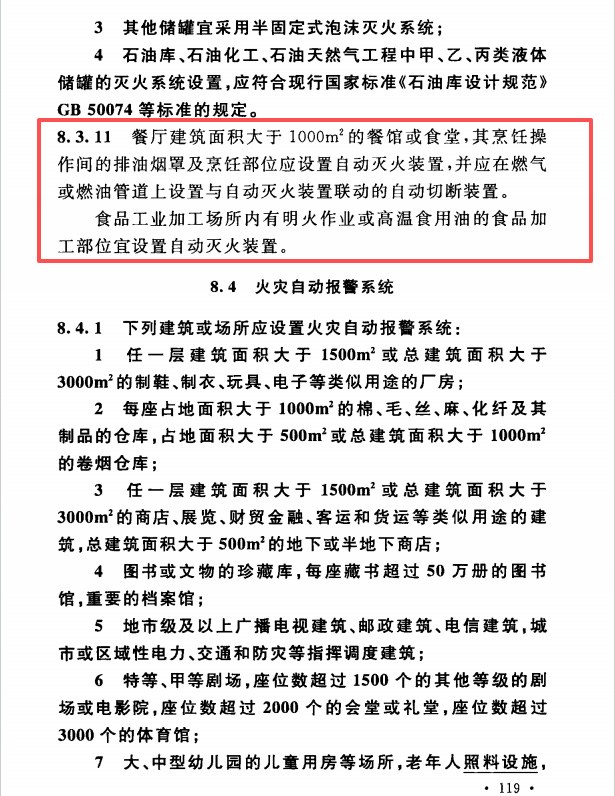 餐饮后厨必须要安装厨房自动灭火装置吗?根据2GB50016-2014《建筑设计防火规范》第119页8.3.11规定,餐厅建筑面积大于1000m的餐馆或食堂,其烹饪操作间的排油烟罩及烹饪部位应设置自动灭火装置(可下载见详情页)